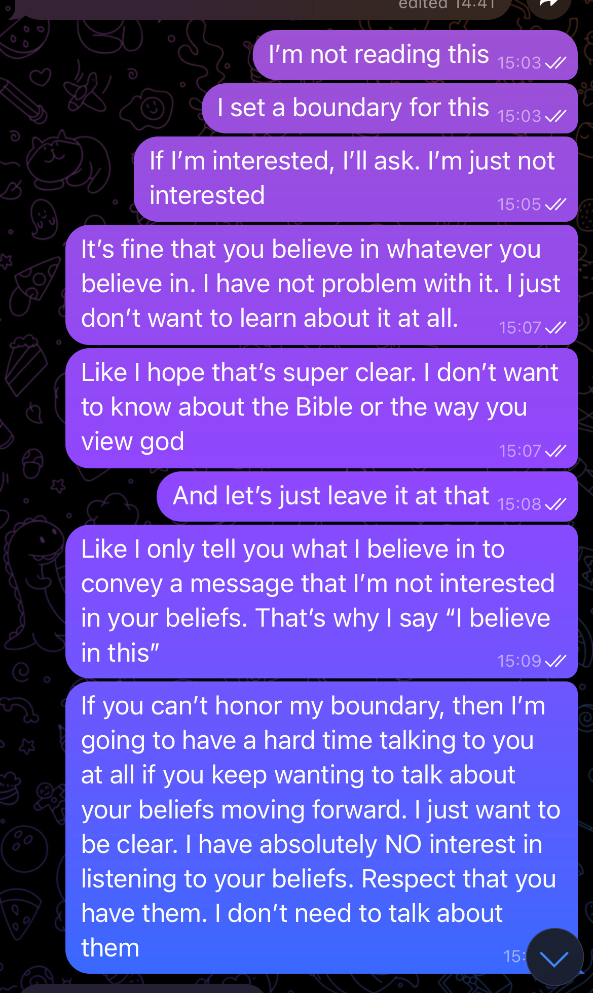 A wall of text floods the DM, taking several swipes to reach the bottom. Eye roll. It was giving indoctrination vibes. Sighhh. Indoctrination. Another energy I have a short fuse for. The familiar fire was bubbling in my gut again. Time to reinforce my boundary again. Just in case anybody wants to see what having a respectful boundary-setting reply looks like, here is what I said:
